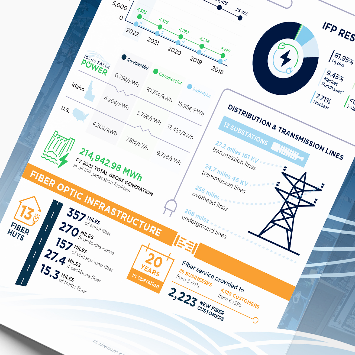 This innovative Annual Report for the City of Idaho Falls Power won acclaim from the Academy of Interactive and Visual Arts for its creative data presentation. It even earned a place on their Annual Report of Annual Reports, which showcases elements of award-winning corporate communications. Packed with data about hydropower, the bold infographics and animated visuals ensure this publication is anything but dry.