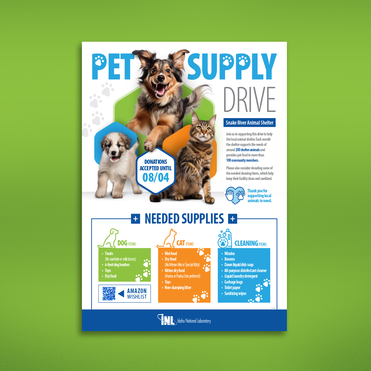 This flyer promoted an employee-operated supply drive for a local animal shelter. It uses design elements from the established Idaho National Laboratory style guide, along with playful imagery and subtle accents to draw the staff's attention.